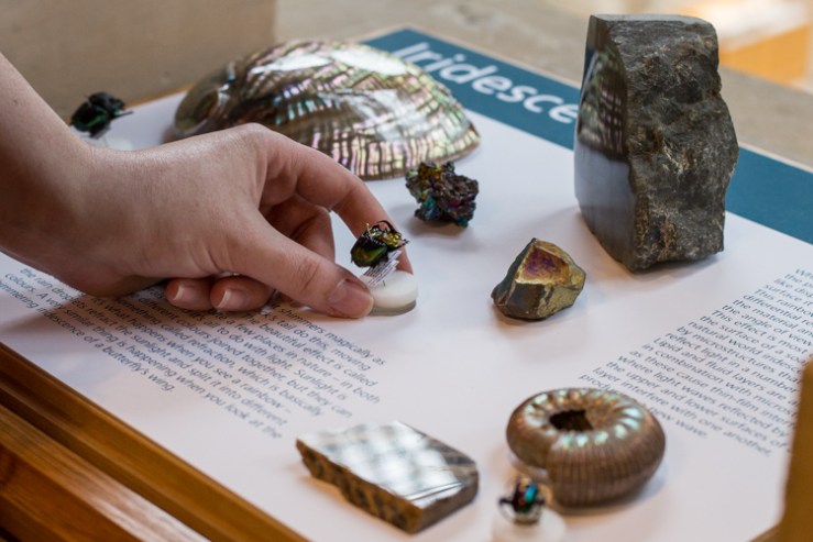 “My favourite case is Iridescence. Not only is it full of beautiful rainbow-hued objects, but it has examples from all areas of the collections. There’s a fossilised ammonite, peacock ore, a Nectarinia bird, a jewel scarab and a Haliotid shell. It’s wonderful to be able to put a truly multi-disciplinary case together, as the opportunity is rare.”