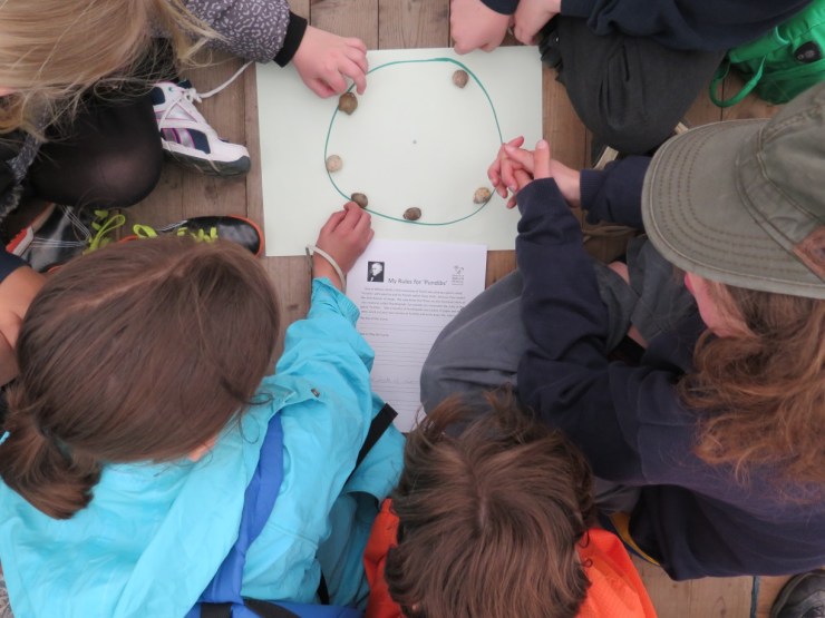 Our brachiopod fossils proved quite challenging to play with. If you rolled them, they veered sideways. If you threw them, they’d bounce in all directions. Variations on skittles, boules, bowls and dice were all suggested, and even a race game to see which would fall to the bottom of a bowl of water first. Perhaps the original game is the one suggested by a former school teacher; children in his school used to play ‘dibs’, a throwing and catching game now better known as ‘knuckle bones’, ‘jacks’ or ‘five stones’.