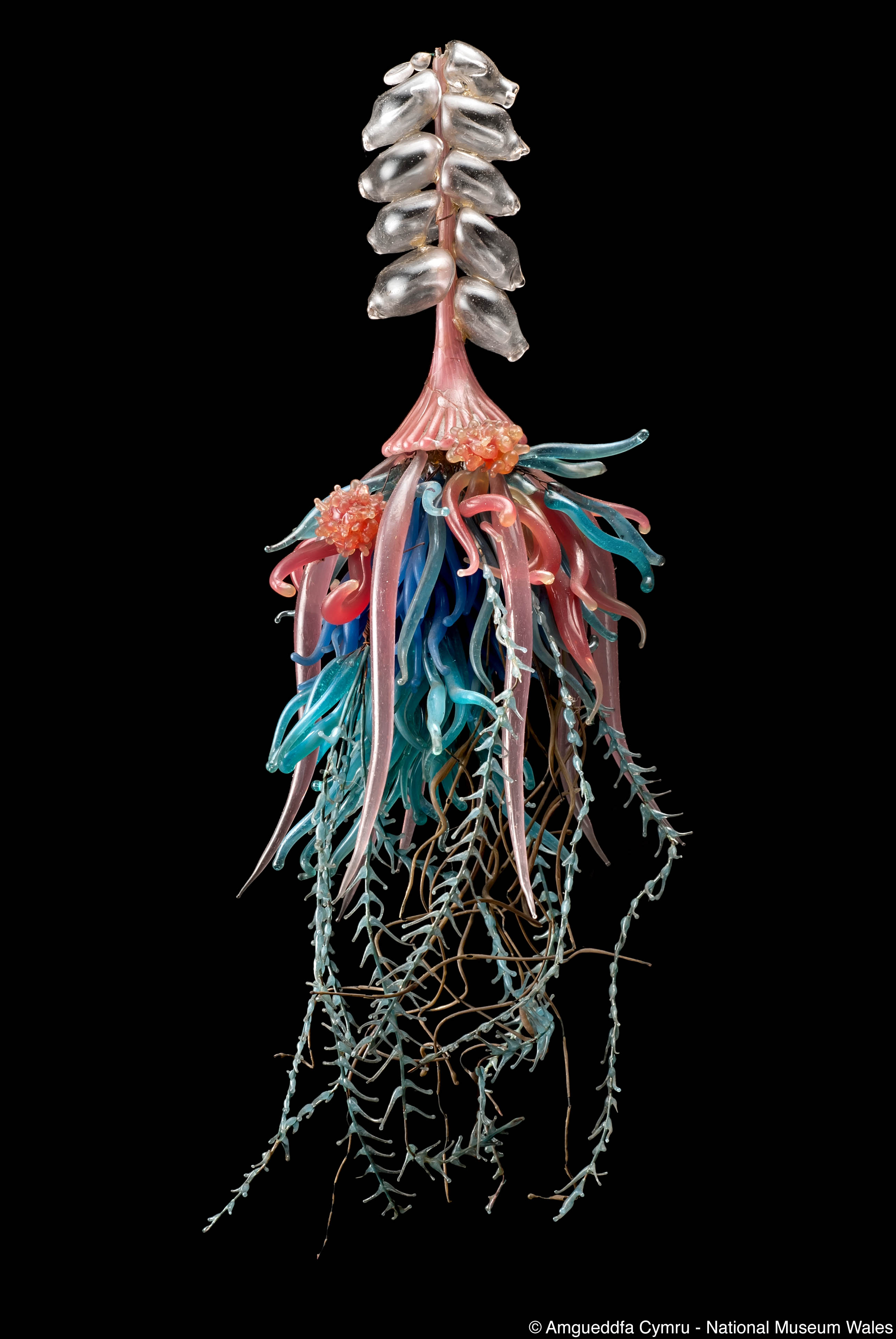 I’m a Blaschka glass model of a marine animal called Physophora hydrostatica – a jellyfish-like animal known as a siphonophore. I was originally made in the 1880’s by the Blaschkas for the Science Museum in London who donated me to Amgueddfa Cymru – National Museum Wales in 1927.