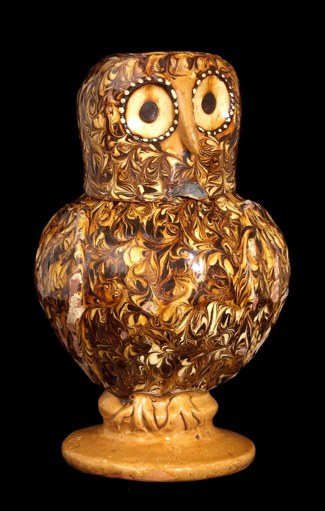 Whooo am I? I’m Ozzy, the Potteries Museum & Art Gallery’s famous slipware owl. I was made in Staffordshire around in the late 17th century, about 350 years ago – just as you were becoming extinct. Unfortunately I can’t tell you who made me – it was so long ago that I’ve forgotten and sadly he didn’t leave his signature or maker’s mark on me so no one knows now. I might look like an owl but I’ll let you into a secret – I’m actually a jug. Look round the back and you’ll see my handle. My head lifts off – but very carefully if you please – and then it becomes the cup for you to drink out of. Mind you, it’s been a long time since anyone had a drink out of me!