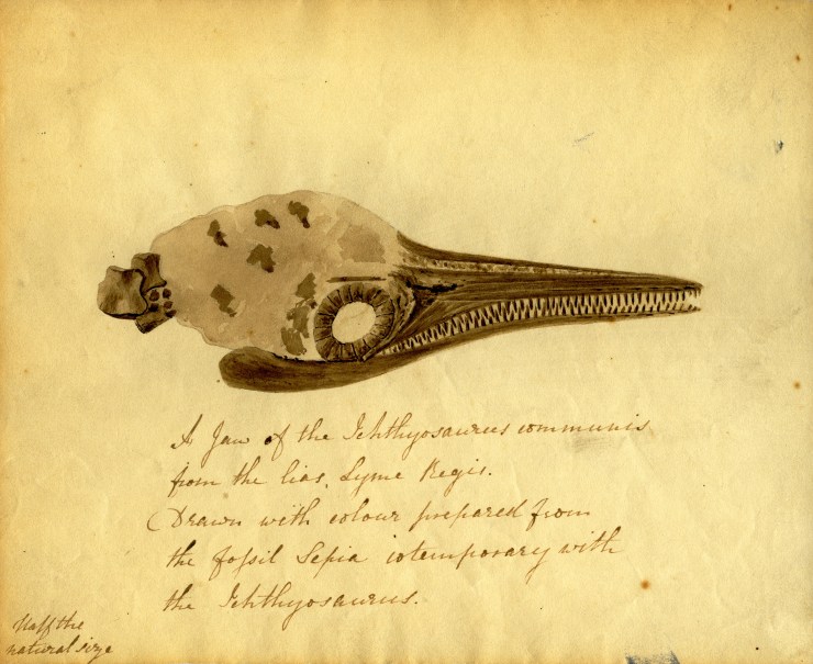 In one letter to Buckland’s wife, Mary, dated 9 December 1833, Elizabeth Philpot enclosed a sketch of an ichthyosaur head that she had painted using ink from a fossil squid of the same age as the ichthyosaur, 200 million years old; this is pictured at the top of the article. The letter also contained a colourful description of Mary Anning’s escapades: