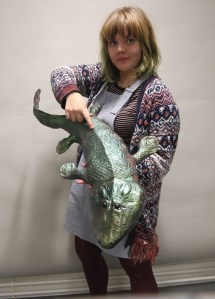 The Coelacanth is a living relative of Tiktaalik and has a similar type of scales, so I used images of this animal to help my research. I also looked at fish which live in similar conditions. I was experimental with the paint, as no one is certain what colour its scales would have been. I used changing pigments over a detailing layer of airbrushed cellulose paint.