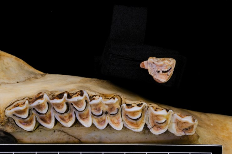 Comparison of an archaeological premolar (top), with the upper right tooth row of a goat-like animal called a serow (Capricornis sumatraensis) from the museum’s collection (OUMNH.ZC.21654). Radiocarbon dating of charcoal from the site indicates the archaeological specimen is over 5,000 years old.