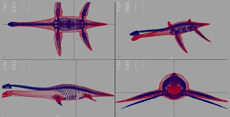 We created the first version of the model to determine proportions and a body shape. After several discussions with Hilary, some improvements were made and the ‘primal model’ of the long-necked plesiosaur was ready for the final touches – adding details, mapping, and textures. We could then move on to create the other 3D models.