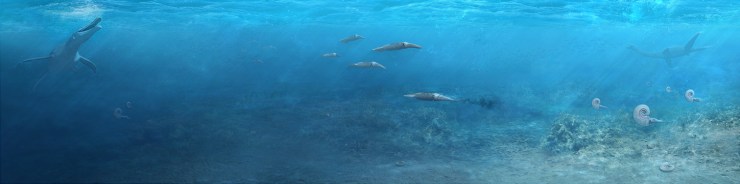 This sumptuous video features on our brand new Out of the Deep display and brings to life the two large marine reptile skeletons seen in the cases. The Museum exhibition team worked with Martin Lisec of Mighty Fossils, who specialise in palaeo reconstructions. Martin and his animators also created a longer video explaining how the long-necked plesiosaur became fossilised, as well as beautiful illustrations of life in the Jurassic seas.