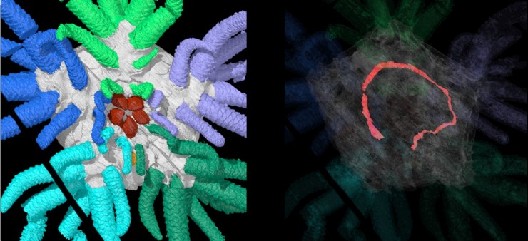 One of the most useful things about our 3D computer reconstruction was that it enabled us to study the inner features of the fossil, as well as the parts visible on the outer surface. This revealed internal soft parts that had never previously been described in this group of fossils. In particular, it allowed us to see an internal ring-like structure within the main body cavity.