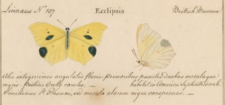 When visiting London, Danish entomologist Johann Christian Fabricius (1745-1808) studied the paintings that Jones made and described over 200 species of butterfly new to science. Fabricius also visited the British Museum where he examined Petiver’s specimen of ecclipsis. In Entomologia systematica (1793) Fabricius revealed the enigmatic ecclipsis to be no more than a painted and “artificially spotted” specimen of the Common Brimstone (Gonepteryx rhamni). So, the dark spots and blue eyes were merely artistic licence, but whose?