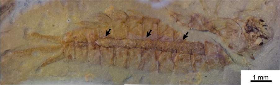 One of the numerous Early Triassic mayfly nymphs from Mallorca preserved with gut contents. These inclusions result from the original sediment the nymphs fed on (cololite, labelled here with arrows). Image adapted from Peñalver et al. (2023).