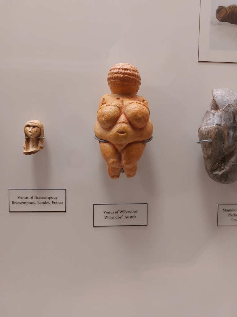 Tucked in a display case in the southwest corner of the Museum is a sculpture of an unidentified female figure, small enough to fit in your coat pocket. It is a replica of one of the most important examples of Palaeolithic artwork ever discovered; a 25,000-year-old carving known as the Venus of Willendorf. The Venus of Willendorf is one of several Palaeolithic statues found in Europe or Asia believed to depict female deities or fertility icons. Known collectively as the Venus Figurines, the carvings are similar in size and subject matter, but each has her own peculiarities. Many are naked, but some of the later examples are wearing distinctive garments, clothes we might describe today as ‘snoods’ or ‘bandeaux’. The Venus of Willendorf is easily distinguished by her statement headpiece; perhaps a spiralling hair-braid or ceremonial wig. But there is another, more exciting interpretation — this strange, thimble-like adornment might actually represent a woven fibre cap, making it the oldest ever depiction of human clothing.