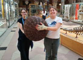 As I was doing this, the team from Outback Rigging worked on carefully lowering the suspended works to the ground and to our surprise; the take down was ahead of schedule. Most of them were removed by the middle of the day and these ones were simple to move. This was interesting to me as they seem so delicate, being large structures made of woven willow, but they proved sturdier than I thought. However, some were more difficult to take down than others, including the COVID sculpture. This was the most difficult to get down to the storage space, due to its intricate structure and its large size. Too wide to take down the stairs we usually use, Rachel organized with the Pitt Rivers to take it through their door, along the road and back into the Museum of Natural History through another door! What made this procedure more complicated was the sculpture itself, as its round construction meant there were no handholds. Luckily, the artist Issy Wilkes created some by looping some zip ties through the metal frame and, learning from the setup of the exhibition, used foam sheets to wrap around these painful to hold ties, to make the journey even easier. I felt it was an extremely rewarding process when we were finally able to put it down, as it required a lot of teamwork and shimmying about corridors to make it – I was very relieved we were able to keep it in one piece.