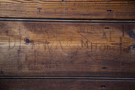 This little room behind the scenes in the museum is entirely wood panelled and seems to have become a spot to make your mark. Covering the walls, the door and even the ceiling are names and dates scratched into or scribbled onto the wood. The dates go as far back as 1920. Names, initials and numbers from the last 10 decades now overlap to create a textured collage.