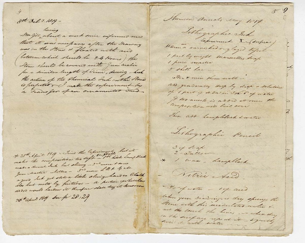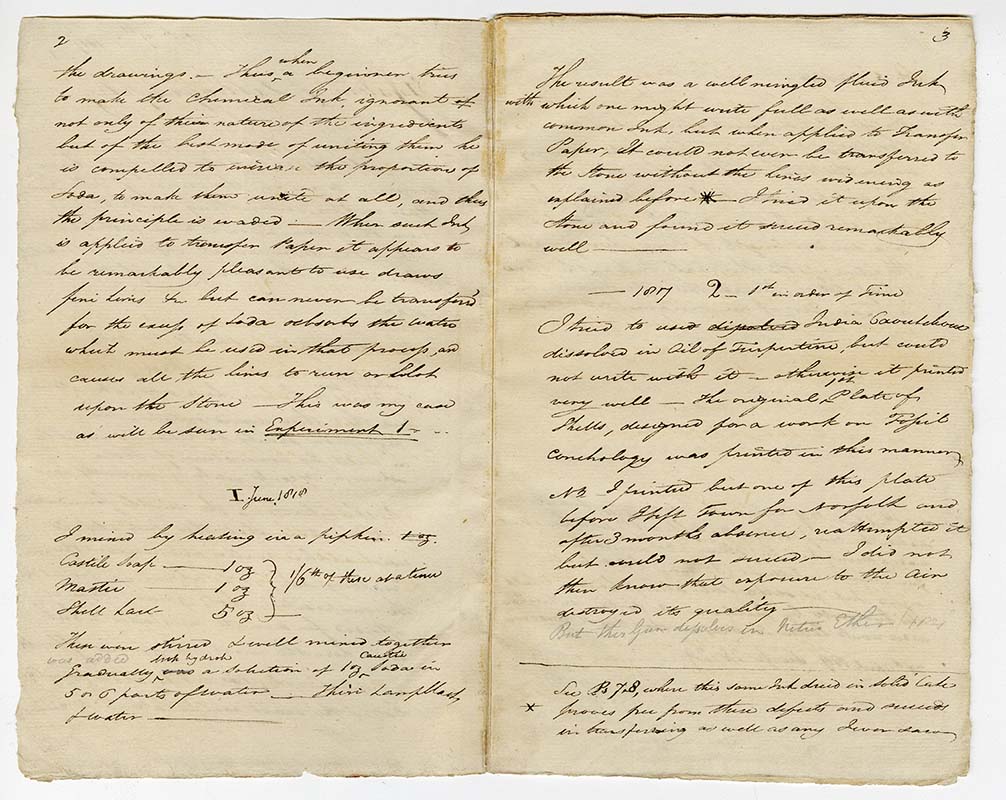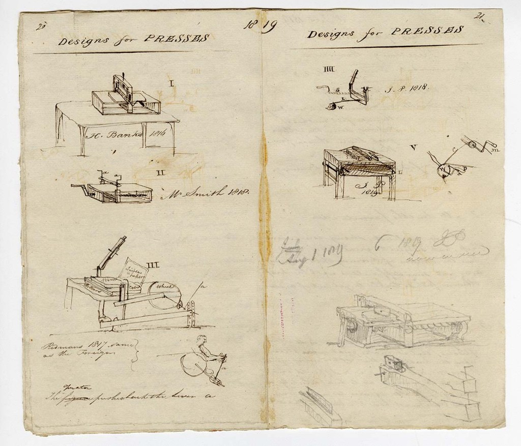 With few works to reference or professionals to consult, Phillips had taken what information he could find and applied himself to testing and recording different ink to chalk ratios for optimal drawing and printing. He even tinkered with existing press designs, trying to invent a more efficient machine. The results of his experiments are preserved today in his notebooks, held here at the Museum.