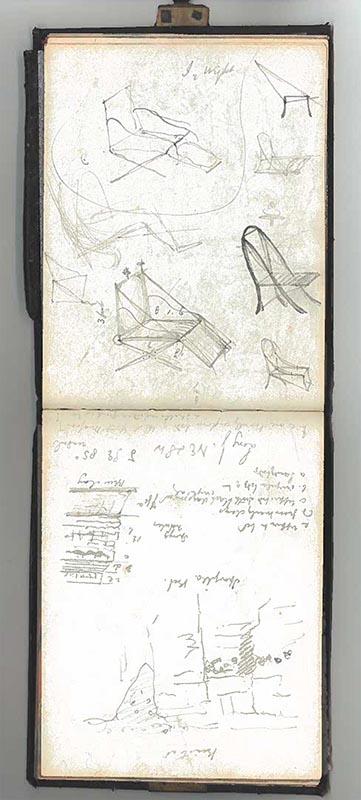 Phillips’ notebooks are filled with detailed observations of natural history from his travels across the UK. They also show his fascination with all things mechanical; doodling whimsical contraptions meant to solve the day-to-day problems of the active naturalist.