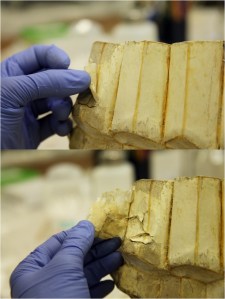 We decided to consolidate this using gelatine as it would be in keeping with the original construction and could easily be reversed if necessary. Gelatine was mixed in water and warmed to make it a thin consistency, and then applied with a paintbrush. Once the paint flakes had softened they could be gently pressed down. Gelatine was also used with acid-free tissue to stabilise the cracks and areas of surface loss on the hive.