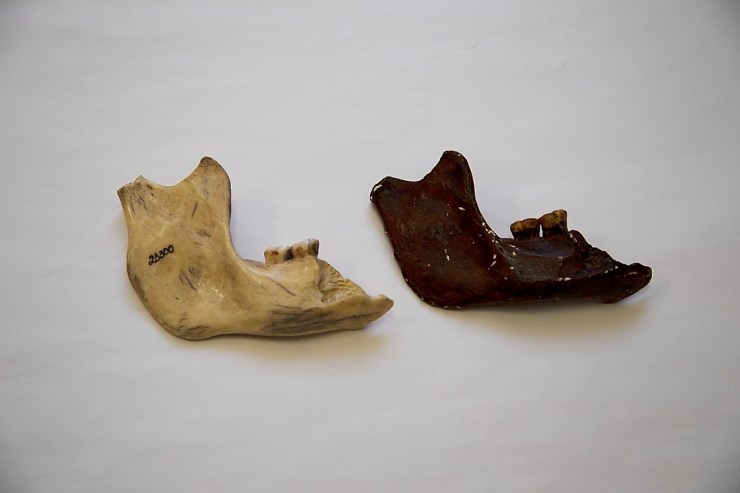 Joseph Weiner’s experimental fake created by modifying an orangutan jaw, alongside a cast of the Piltdown jaw