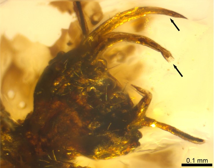 The larvae were almost certainly trapped by resin while clutching the eggs from which they had freshly emerged. Such behaviour is common among modern relatives while their body hardens and their predatory jaws become functional. Indeed, the two mouthparts forming the jaws are not assembled in most of the fossil larvae, which indicates, together with the large relative size of the head and legs, that they were recently born.