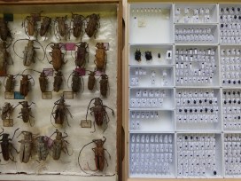The big ones are from a family of beetles called Cerambycidae or Longhorn Beetles. This family is found all over the world and varies greatly in size and colour. These ones are particularly interesting to me because of the historic collection they are from. The vast Baden-Sommer collection, containing many different beetle families, came to the museum via a dealer in 1910 and unusually it is still in its original layout. The labels you can see in the drawer were written by the two entomologists that collected the specimens, J. Baden and M. Sommer.