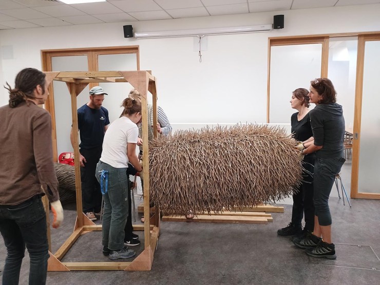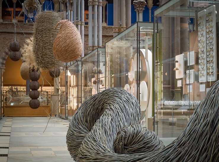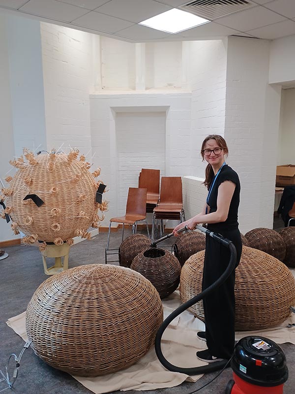 As I was doing this, the team from Outback Rigging worked on carefully lowering the suspended works to the ground and to our surprise; the take down was ahead of schedule. Most of them were removed by the middle of the day and these ones were simple to move. This was interesting to me as they seem so delicate, being large structures made of woven willow, but they proved sturdier than I thought. However, some were more difficult to take down than others, including the COVID sculpture. This was the most difficult to get down to the storage space, due to its intricate structure and its large size. Too wide to take down the stairs we usually use, Rachel organized with the Pitt Rivers to take it through their door, along the road and back into the Museum of Natural History through another door! What made this procedure more complicated was the sculpture itself, as its round construction meant there were no handholds. Luckily, the artist Issy Wilkes created some by looping some zip ties through the metal frame and, learning from the setup of the exhibition, used foam sheets to wrap around these painful to hold ties, to make the journey even easier. I felt it was an extremely rewarding process when we were finally able to put it down, as it required a lot of teamwork and shimmying about corridors to make it – I was very relieved we were able to keep it in one piece.
