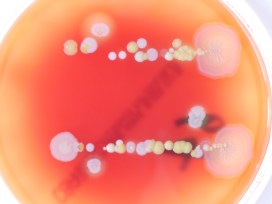 It is also possible to include dyes, antibiotics and other substances that speed up or slow down the growth of certain types of bacteria to help us select and identify particular bacterial species. This photo, for example, shows a chromogenic agar plate, which contains special dyes that change colour in the presence of substances produced by the bacteria as part of their survival and growth. Pink colonies in this case, for example, contain enzymes that break down lactose, a type of sugar. – Nicole Stoesser