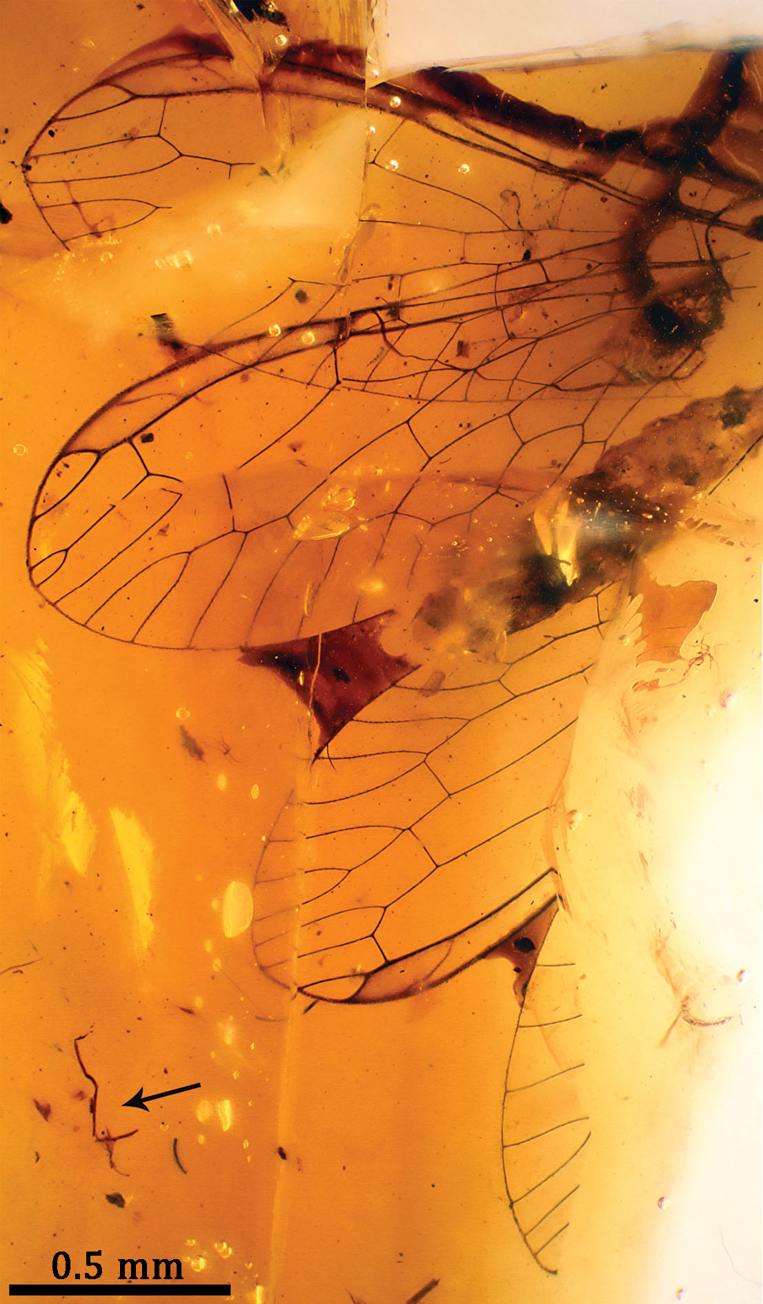 Left: William Potter Herrera examines a snakefly preserved in amber. Right: Necroraphidia arcuata, a snakefly species from El Soplao amber (Cantabria, Spain). The arrow points to a fragment of burnt plant matter (extracted from Pérez-de la Fuente et al., 2012. Zookeys 204).