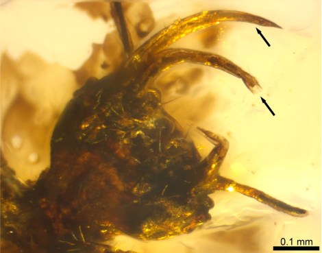 Detail of a head with the jaws still dislodged, indicating that the larva was recently hatched when it was ensnared by amber and the jaws had not yet had time to fully assemble.