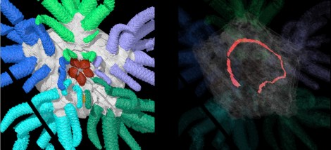3D reconstruction of Sollasina cthulhu. Left-hand image shows part of lower surface. Right-hand image shows same view with outer surface partly transparent to reveal inner ring (in red). Credit: Imran Rahman, Oxford University Museum of Natural History