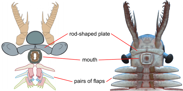 The predatory arthropod Amplectobelua symbrachiata is a good example. We drew heavily upon a 2017 paper by Dr Peiyun Cong and colleagues, which included a very detailed reconstruction of the head region. This reconstruction shows that the underside of the head of Amplectobelua consisted of a rod-shaped plate, a mouth made up of two rows of plates, and three pairs of flaps with spiny appendages, all details that are included in our 3D model.